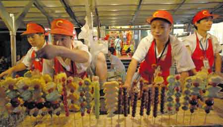 des insectes de toutes sortes et de toutes tailles, les plus petits présentés en brochettes, servis nature ou avec des sauces sucrées ou pimentées, des étoiles de mer frites, c'est très croquant.