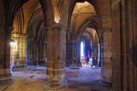 Les énormes et très nombreux piliers entourent le tombeau de St Mungo. Ne pas oublier qu'au dessus se trouve la cathédrale, la crypte soutient l'édifice.