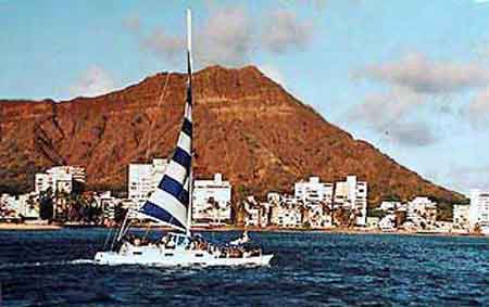 Les immeubles de Honolulu au loin, et au premier un superbe catamaran. .
