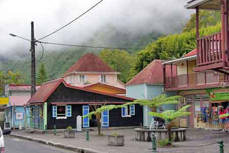 La rue principale de Hell Bourg est dominée par le Piton d'Enchaing, souvent dans les nuages, ou sous la pluie, c'est selon.